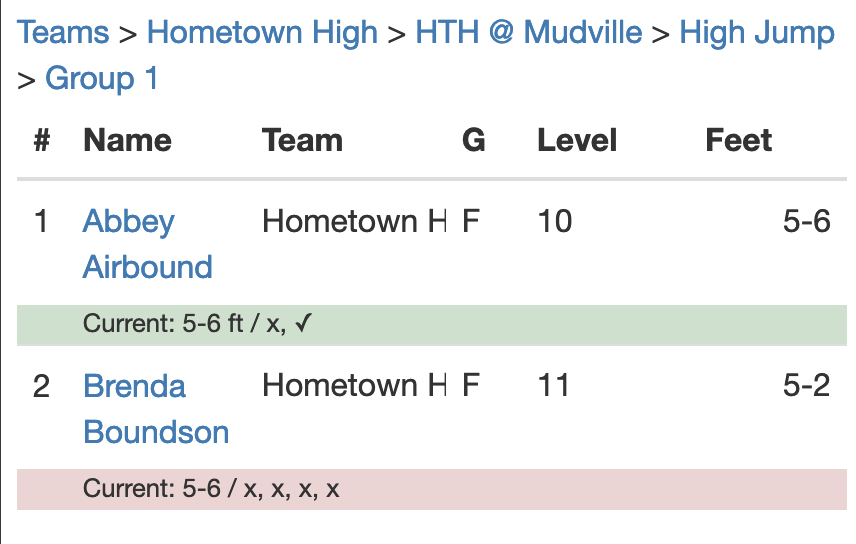- As each attempt is recorded, the current height and attempts will also show beneath the name of each athlete in the list. The background of the line will turn red once they have failed all their attempts to clear a certain height.